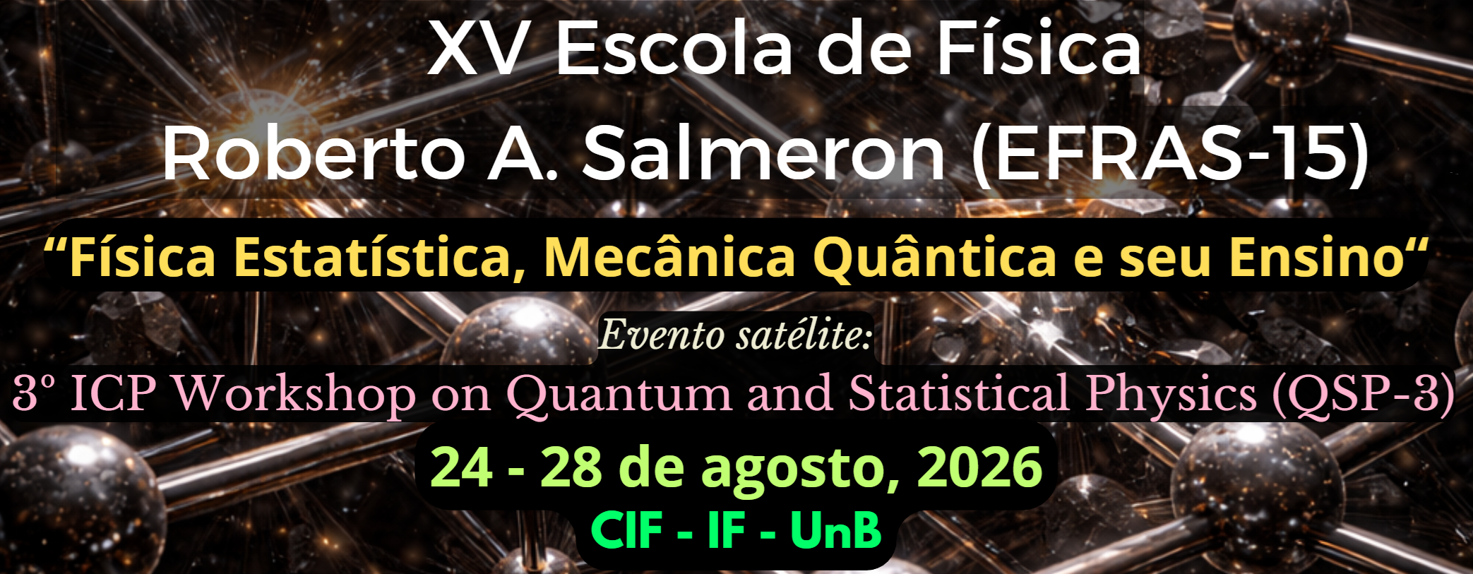 Apresentação Cronograma Local Comissões Inscrições e auxílios Taxa de inscrição Histórico Cartaz Apresentação A XV Escola de Física Roberto A. Salmeron (EFRAS-15) será realizada entre os dias 24 e 28 de agosto de 2026 no Centro Internacional de Física da Universidade de Brasília, tendo como o tema: Mecânica Estatística, Física Quântica e seu Ensino. A escola consistirá de minicursos, palestras e sessão de pôsteres. Minicursos confirmados: Relações de incerteza na Mecânica QuânticaProfessor: Viktor Dodonov (UnB) Física Estatística de líquidosProfessora: Vera Bohomoletz Henriques (USP) Criptografia Quântica: onde os fundamentos encontram a tecnologia Professor: Fernando de Melo (CBPF) Processos de disseminação em redes complexasProfessor: Silvio da Costa Ferreira Junior (UFV) Introdução à Termodinâmica QuânticaProfessor: Norton G. de Almeida (UFG) Os nomes de palestrantes e os títulos de demais palestras serão divulgados em breve. XV EFRAS terá como evento satélite "3º ICP Workshop on Quantum and Statistical Physics" (QSP-3), que consistirá de contribuições orais (contributed talks) sobre todas as áreas de Física Quântica, Física Estatística e seu Ensino. Cronograma Preliminar Horário 2a-feira 3a-feira 4a-feira 5a-feira 6a-feira 9:00-11:00 QSP-3 11:00 - 11:30 QSP-3 Posters QSP-3 11:30 - 12:30 Palestra 1 Palestra 3 Palestra 6 Palestra 8 12:30 - 14:00 Almoço 14:00 - 15:00 Palestra 2 Palestra 4 Palestra 5 Palestra 7 Palestra 9 15:00 - 16:15 Coffee break, posters e discussões 16:15 - 16:45 Minicurso 1 Minicurso 1 Minicurso 3 Minicurso 3 Minicurso 4 16:45 - 18:00 Minicurso 2 Minicurso 2 Minicurso 4 Minicurso 5 Minicurso 5 *QSP-3: Contributed talks de 3º ICP Workshop on Quantum and Statistical Physics Os participantes com pelo menos 70% de presença nas atividades de EFRAS ou QSP-3 receberão respectivos certificados de participação. Local O evento será realizado no Auditório do Centro Internacional de Física (CIF), localizado no Campus Darcy Ribeiro da Universidade de Brasília: Contato para informações: adodonov (at) unb.br (Alexandre Dodonov) Comissão Organizadora (UnB) Alexandre Dodonov Nathann Teixeira Rodrigues Marcello Ferreira Frank Eduardo da Silva Steinhoff Demétrio Antônio Da Silva Filho Caio Cesar Holanda Ribeiro Ismael Segundo da Silva Carrasco (UFV) Comitê Científico Fábio Aarão Reis (UFF) Fernando Albuquerque de Oliveira (UnB) Celso Jorge Villas-Bôas (UFSCar) Lucas Chibebe Céleri (UFG, USP) Inscrições Período de inscrições: 20/04/2025 a 02/08/2026. Modalidade de inscrições: só ouvinte ou participante com apresentação de pôster (sujeito ao aceite). Decisão sobre a inscrição: até 21 dias após o recebimento da inscrição. Participantes interessados em apresentar contribuição oral, deverão se inscrever no QSP-3 (sujeito ao aceite). Maiores informações e o formulário de inscrição serão disponibilizados em breve. Auxílio a estudantes externos Será disponibilizado um número limitado de vagas nos apartamentos de trânsito da UnB, onde estudantes de fora do DF que apresentarem pôster ou contribuição oral poderão se hospedar sem nenhum custo por até 6 dias. Como o número dos apartamentos de trânsito é limitado, os estudantes serão atendidos por ordem de inscrição dos trabalhos. Taxa de inscrição Estudantes regularmente matriculados em cursos de graduação ou pós-graduação em Física ou áreas afins: isento Professores da UnB: isento Membros e visitantes do CIF: isento Demais participantes: R$ 150,00 a ser pago via PIX (maiores informações em breve). Histórico A Escola de Física Roberto A. Salmeron (EFRAS) é uma escola de caráter nacional voltada para a formação complementar de alunos de graduação e pós-graduação, que a cada edição procura e acentua a sua internacionalização. Sua programação contempla oficinas práticas sobre temas atuais de física, palestras, mesas redondas e apresentações de trabalhos dos inscritos na forma de apresentações orais e pôsteres, promovendo um meio apropriado para a formação de alunos, bem como sua interação com professores e estudantes brasileiros e estrangeiros. A Escola é promovida pelo Centro Internacional de Física e Instituto de Física da UnB, e ocorre ininterruptamente desde 2012. O nome EFRAS é uma homenagem a um dos professores fundadores do Instituto de Física da Universidade de Brasília (IF-UnB) - o Prof. Roberto A. Salmeron (São Paulo, 16 de junho de 1922 – Paris, 17 de junho de 2020), que foi um físico proeminente na área de partículas elementares, tendo atuado, além do IF-UnB, no CRNS (França), onde se aposentou. A EFRAS tem acontecido anualmente desde 2012 e costuma focar em um grande tema a cada evento, conforme descrito abaixo Mecânica Quântica - fundamentos e aplicações (2012) Interações Fundamentais (2013) Fenômenos críticos e Transições de Fase (2014) Novas fronteiras em Ciência dos Materiais (2015) Avanços na interação radiação-matéria: Temperatura, dissipação e emaranhamento (2016) Ensino de Física (2017) New Trends in Quantum Field Theory (2018) Aprendizagem de Máquina na Física e Ciências Exatas (2019) Quantum Mechanics: foundations and new trends (2020) Gravity: new trends and perspectives (2021) Física e seu Ensino (2022) Jornada Científica e Acadêmica da Física, em comemoração aos 50 anos de graduação em Física na UnB (2023) Mãos na massa em Tecnologias Quânticas e Inteligência Artificial (2024) Modern Topics in Mathematical Physics (2025) A série de eventos "ICP Workshop on Quantum and Statistical Physics" foi estabelecida em 2024 e visa promover um ambiente propício para difundir descobertas recentes, discutir novas tendências e estimular o diálogo para catalisar avanços científicos em diversas áreas de Física Quântica e Física Estatística. Para os alunos de graduação e pós-graduação, o workshop representa uma oportunidade par
