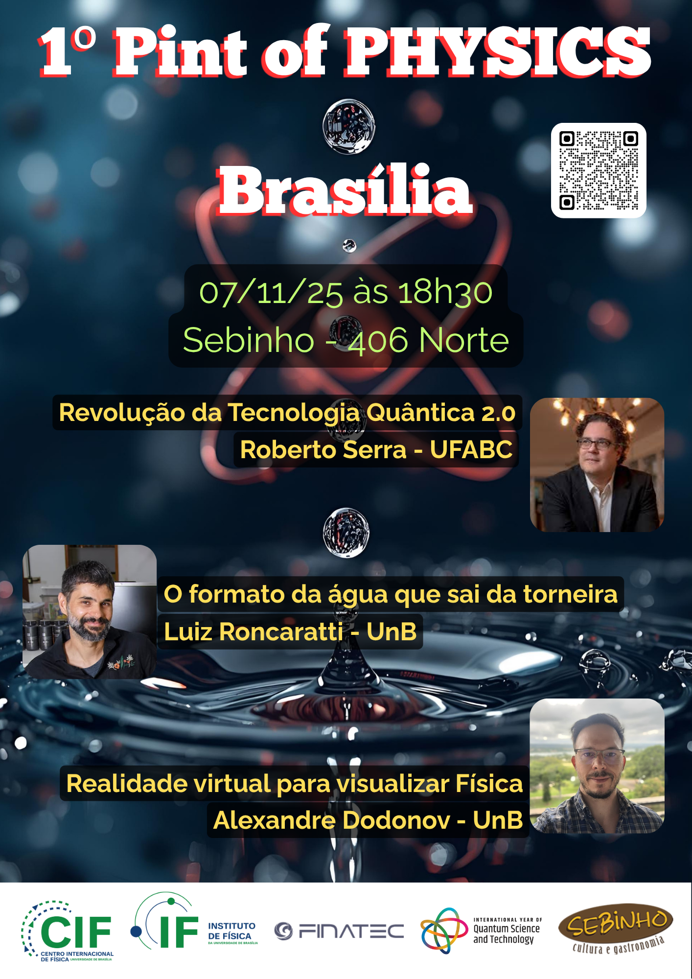 Pint of Physics - Brasília O Pint of Physics de Brasília nasceu de uma boa conversa de bar entre professores e estudantes do Centro Internacional de Física (CIF) e do Instituto de Física da UnB. A ideia surgiu durante um dos Happy Hours Quânticos do CIF — encontros descontraídos que acontecem nas noites de sextas-feiras, após os Colóquios do CIF, quando professores do IF-UnB, estudantes e palestrantes convidados se reúnem para continuar as discussões científicas em um ambiente informal. A proposta é simples: conversar sobre as descobertas mais recentes da Física e da Astronomia de forma leve, acessível e divertida — no melhor estilo Discovery Channel. Enquanto isso, o público pode aproveitar o jantar e beber o que quiser: cerveja, vinho, drinks, suco, água com gás ou qualquer outra coisa que der vontade. Nos intervalos entre as palestras, o público tem a oportunidade de conversar diretamente com os palestrantes. Essa interação faz parte do espírito do evento, que busca aproximar a sociedade do universo das descobertas científicas. E o melhor de tudo: o Pint of Physics é pensado especialmente para o público leigo. A ideia é que qualquer pessoa possa vivenciar a experiência de ouvir as últimas novidades da Física e da Astronomia diretamente de cientistas renomados — quase como participar de uma conferência científica, mas em um ambiente descontraído e acessível a todos. 2ª Edição: abril de 2026 O 2º Pint of Physics - Brasília ocorrerá na sexta-feira, 17 de abril de 2026, e fará parte de celebrações do mês mundial de Astronomia. Por isso, ele focará em dois temas facinantes de Astrofísica e Cosmologia - estrelas de nêutros e buracos negros. O objetivo das palestras será introduzir esses conceitos para um público leigo, e depois comentar as últimas descobertas para estudantes e professores de Física e áreas afins. Este Pint of Physics fará parte da 1ª Jornada de Astrofísica e Cosmologia do CIF (JACIF-1), que também incluirá um Colóquio do CIF no dia 24 de abril, ministrado pela Premiada Prof. Rita dos Anjos da UFPR na área de Astrofísica (raios cósmicos). Esperamos que JACIF vire um evento anual do CIF, para celebrar o mês mundial de Astronomia e áreas correlatas. Palestras Estrelas de Nêutrons e os extremos da matériaProf. Jonas Pedro Pereira (IF - UnB)Google Scholar, Lattes Buracos negros nas ondas de rádioProf. Ciriaco Goddi (IAG - USP)Google Scholar, Lattes Cronograma 18:00: Chegada do público (para garantir o lugar) 18:30: Abertura do Pint of Physics 18:40: Estrelas de Nêutrons e os extremos da matéria (Prof. Jonas Pedro Pereira - UnB) 19:40: Buracos negros nas ondas de rádio (Prof. Ciriaco Goddi - USP) 20:30 Encerramento do Pint of Physics 21:00: Fechamento do Sebinho Local Sebinho Livraria, Cafeteria, Bistrô e RestauranteEndereço: Comércio Local Norte 406, Bloco C, Loja 44 - Asa Norte, Brasília(Google maps) Organização Alexandre Dodonov (IF-UnB) Jonas Pedro Pereira (IF-UnB) Luiz Roncaratti (IF-UnB) Contato adodonov (at) unb.br Apoio FUNAPE - Fundação de Apoio À Pesquisa Sebinho Livraria, Cafeteria, Bistrô e Restaurante CIF - UnB IF - UnB [Cartaz em PDF] Edições anteriores Na primeira edição de Pint of Physics - Brasília, realizada em 7 de novembro de 2025, fomos do mundo das Tecnologias Quânticas (Nobel de Física de 2025) aos fenômenos do dia a dia (como a forma da água saindo da torneira), passando ainda pelo fascinante universo da Realidade Virtual, que nos deixa literalmente dentro dos fenômenos físicos! Cartaz em PDF Palestrantes Roberto Menezes Serra (CCNH - UFABC)Google Scholar, Lattes Luiz Roncaratti (IF - UnB)Google Scholar, Lattes Alexandre Dodonov (IF - UnB)Google Scholar, Lattes Cronograma 18:00: Chegada do público (para garantir o lugar) 18:30: Abertura do Pint of Physics 18:40: Realidade virtual para visualizar Física (Prof. Alexandre Dodonov) 19:00: Revolução da Tecnologia Quântica 2.0 (Prof. Roberto M. Serra) 19:50: O formato da água que sai da torneira (Prof. Luiz Roncaratti) 20:30 Encerramento do Pint of Physics 21:00: Fechamento do Sebinho Local Sebinho Livraria, Cafeteria, Bistrô e RestauranteEndereço: Comércio Local Norte 406, Bloco C, Loja 44 - Asa Norte, Brasília(Google maps) Organização Luiz Roncaratti (IF-UnB) Alexandre Dodonov (IF-UnB) Contato adodonov (at) unb.br Apoio FINATEC Sebinho Livraria, Cafeteria, Bistrô e Restaurante CIF IF - UnB Cardápio do Sebinho (em novembro de 2025) Cardápio completo Taxa de rolha: R$ 30 por produto Carta de vinhos