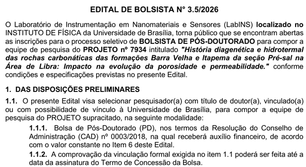 EDITAL DE BOLSISTA N° 3.5/2026 O Laboratório de Instrumentação em Nanomateriais e Sensores (LabINS) localizado no INSTITUTO DE FÍSICA da Universidade de Brasília, torna público que se encontram abertas as inscrições para o processo seletivo de BOLSISTA DE PÓS-DOUTORADO para compor a equipe de pesquisa do PROJETO nº 7934 intitulado "História diagenética e hidrotermal das rochas carbonáticas das formações Barra Velha e Itapema da seção Pré-sal na Área de Libra: Impacto na evolução da porosidade e permeabilidade." conforme condições e especificações previstas no presente Edital. Edital completo em PDF
